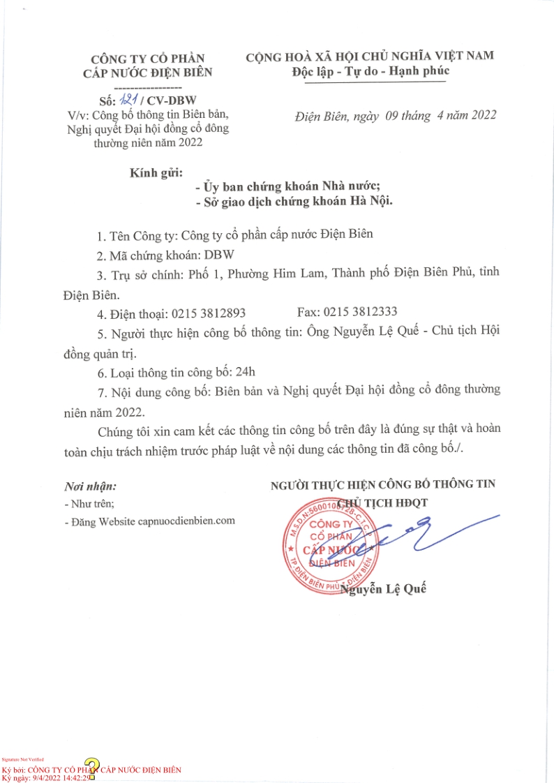 Công ty cổ phần cấp nước Điện Biên công bố thông tin, biên bản & nghị quyết đại hội đồng cổ đông thường niên năm 2022
