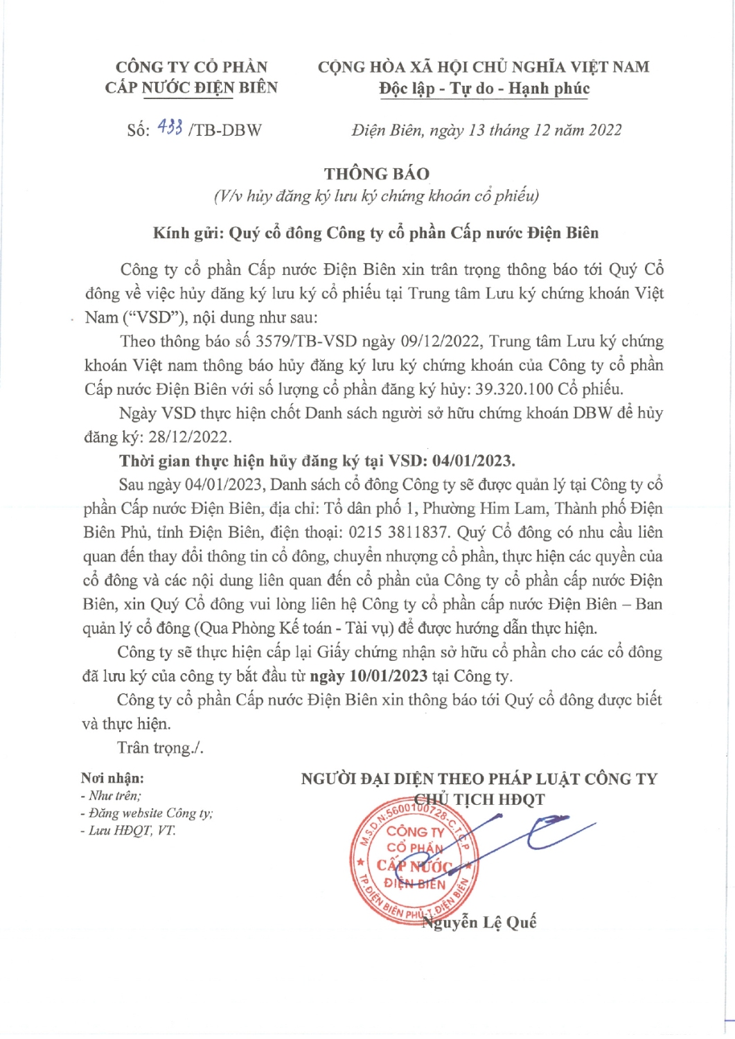 Công ty cổ phần cấp nước Điện Biên xin thông báo V/v huỷ đăng ký lưu ký chứng khoán cổ phiếu